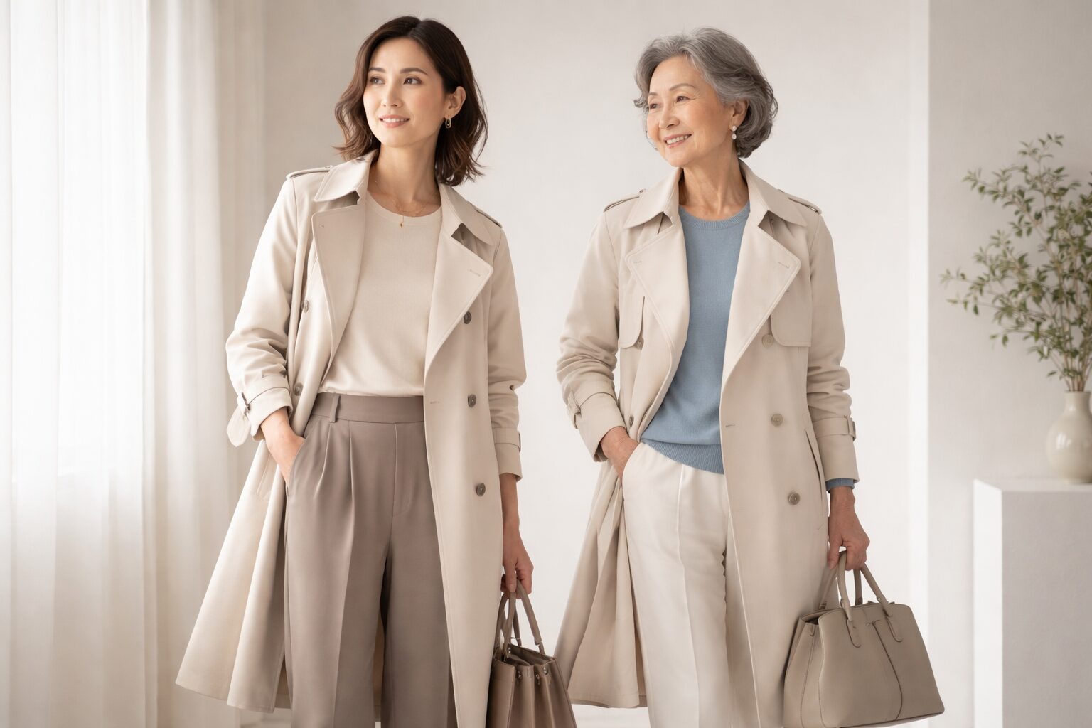 例えば20代なら、トレンド感のあるカラーや若々しいシルエットのアイテムを選ぶとバランスが取れます。30代〜40代はブランドの王道である落ち着いた色合いのトレンチコートやジャケットがぴったり。50代以上の方には、品質の高さが際立つシンプルなデザインのコートや小物がおすすめです。
