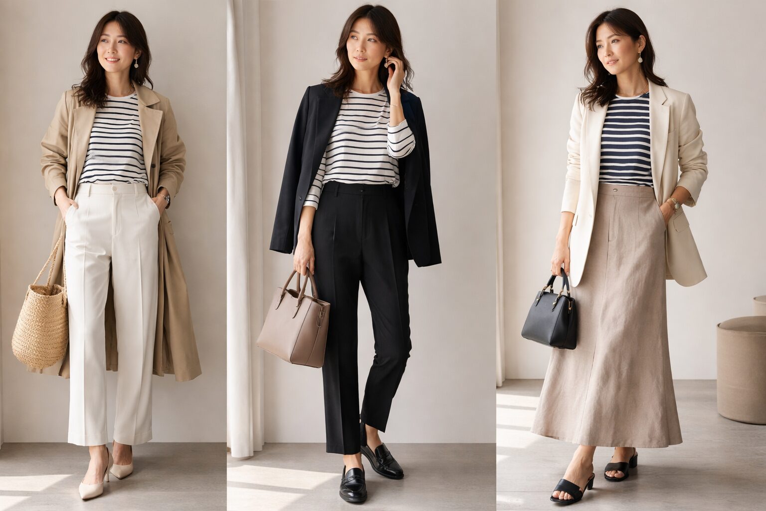 気温の変化に対応できる重ね着スタイルが春の基本です。朝晩の冷え込みと日中の暖かさの両方に対応できるコーディネートを心がけることが重要ですね。